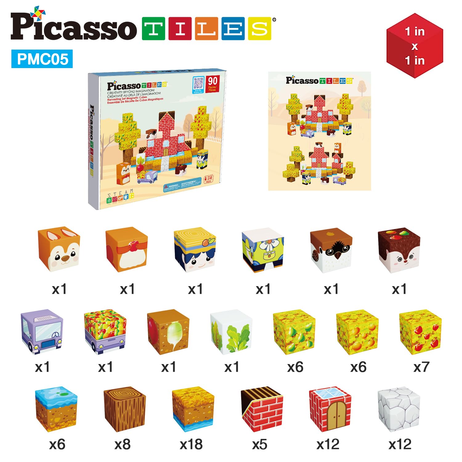 - DREAM BIG & BUILD BIG: PicassoTiles 90 piece magnetic building puzzle cubes are sized at 1”x1” and feature 6 unique prints per cube, creating a total of 540 dynamic patterns. Watch as charming animal figures, a farmhouse, fruit trees, a farmer, and more come to life in endless combinations. This educational set is perfect for encouraging imagination, creativity, storytelling and fun in children, transforming pretend play into a valuable learning adventure. Ideal for ages 3 and up.