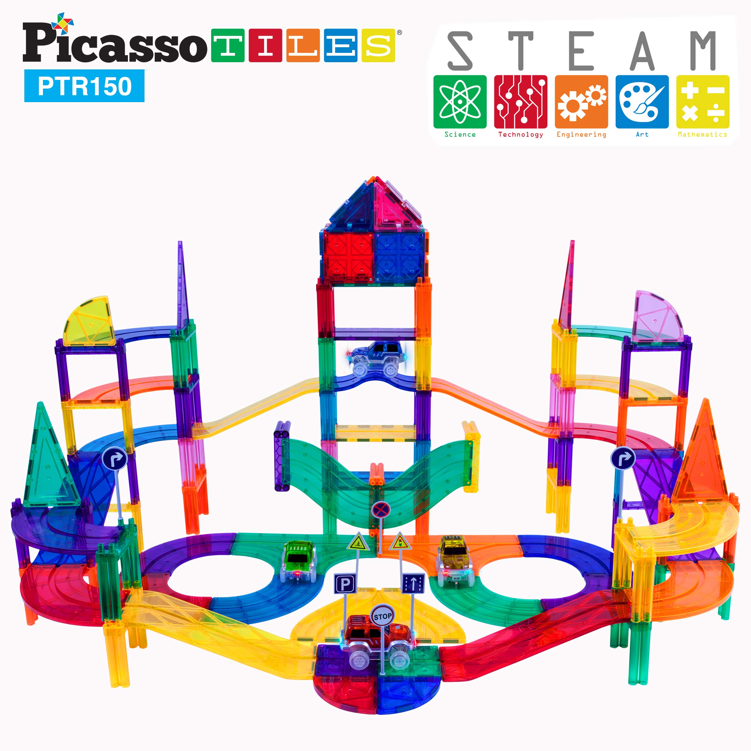 PicassoTiles 150PC Magnetic Race Car Track + 3 LED Light Up Truck Cars + 6PC Expansion Ramp Tiles Mega Bundle: STEAM Learning, Enhance Construction Skills, Hand-Eye Coordination and Fine Motor Skills