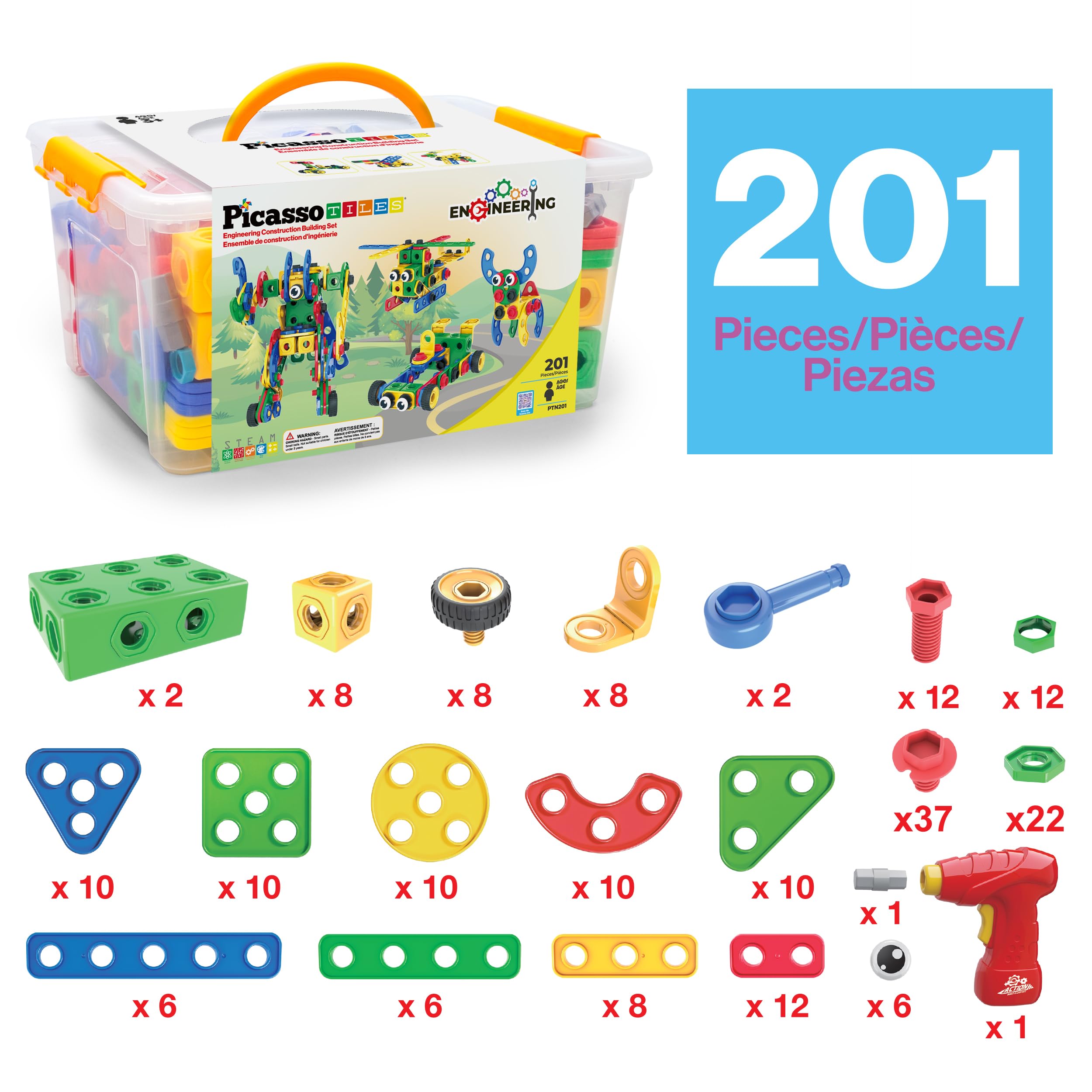 PicassoTiles 201pc STEM Learning Block Construction Kit with Power Drill and Clickable Ratchet Educational Engineering Toy Set Kids Age 3 Plus Preschool Activity Creative Play with Idea Book PTN201