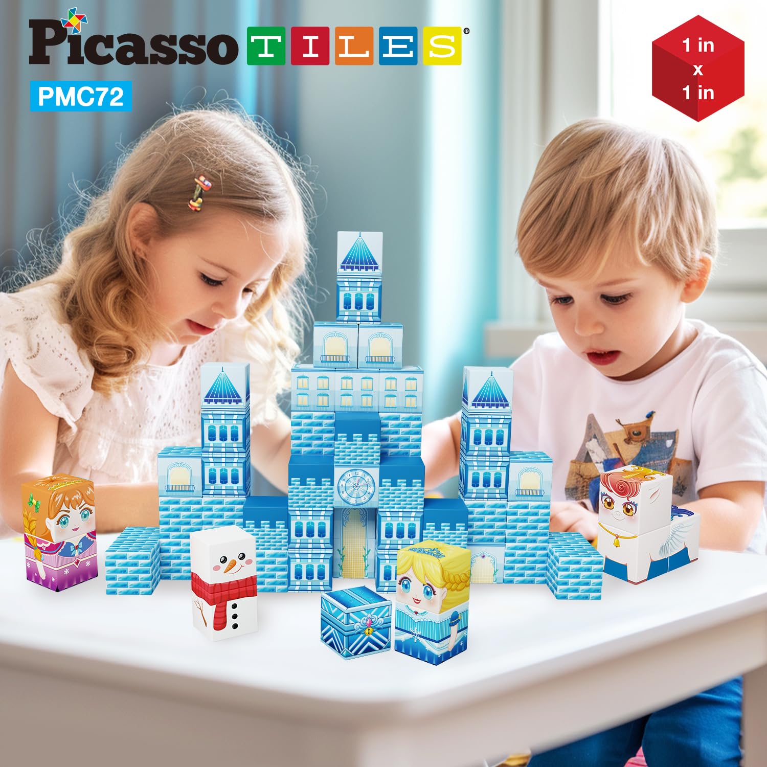 - DREAM BIG & BUILD BIG: PicassoTiles Winter Ice Theme Magnetic Cube Construction Building Block Toy consists of 72 cubes. Each cube measures 1āx1" and comes with 6 printings per cube, offering a total 432 puzzle patterns & allowing you to create 7 charming characters such as a snowman, unicorn, gnome, 2 soldiers, and 2 princesses, in addition to a specially designed castle. Stack the characters inside the castle or keep them outside, the possibilities for imaginative play are truly endless