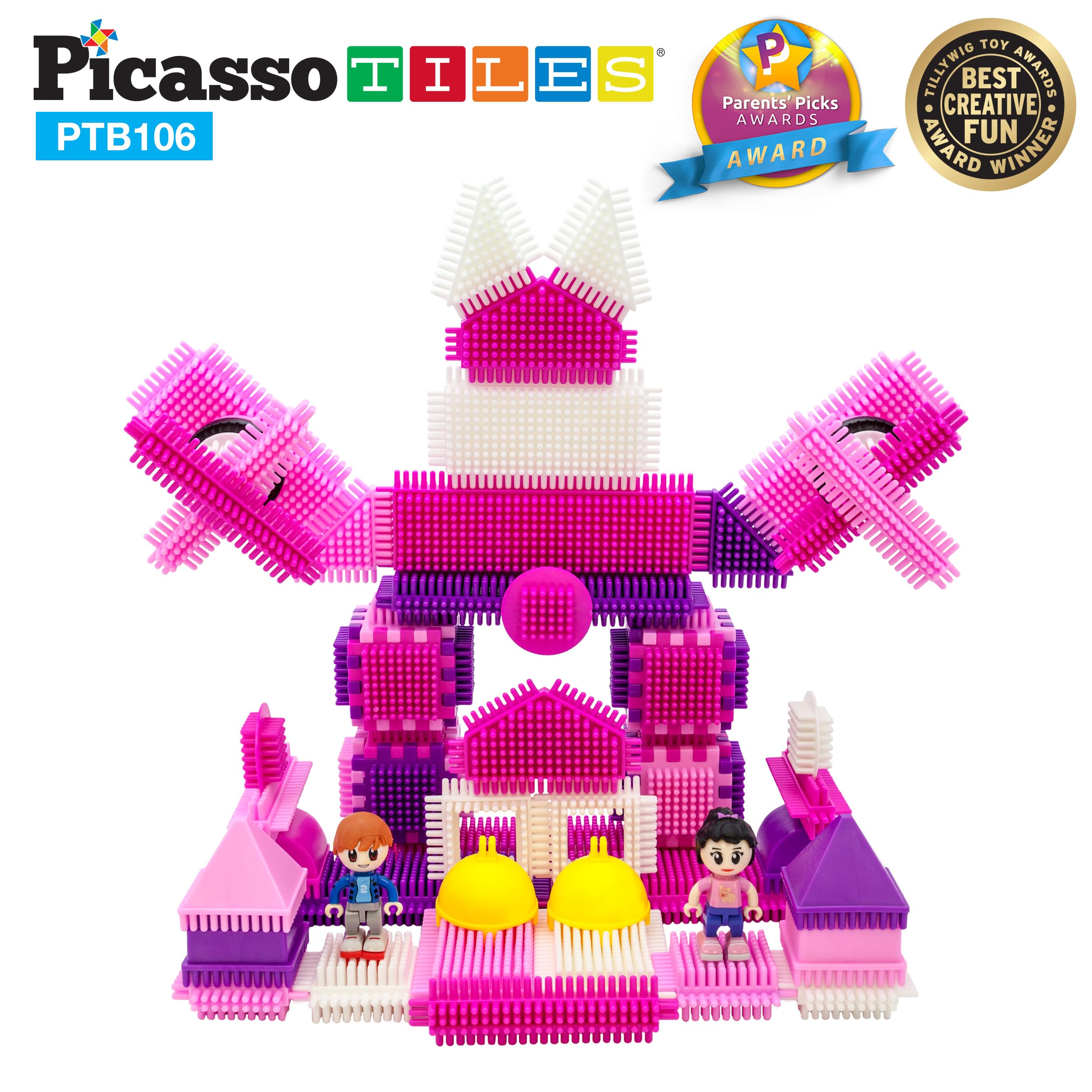 PicassoTiles PTB106 106pcs Hedgehog Lock Building Blocks Tiles Pink Castle Theme Set w/Human Figures Learning Playset STEM Toy Set Educational Kit Child Brain Development Preschool Kindergarten Toy—