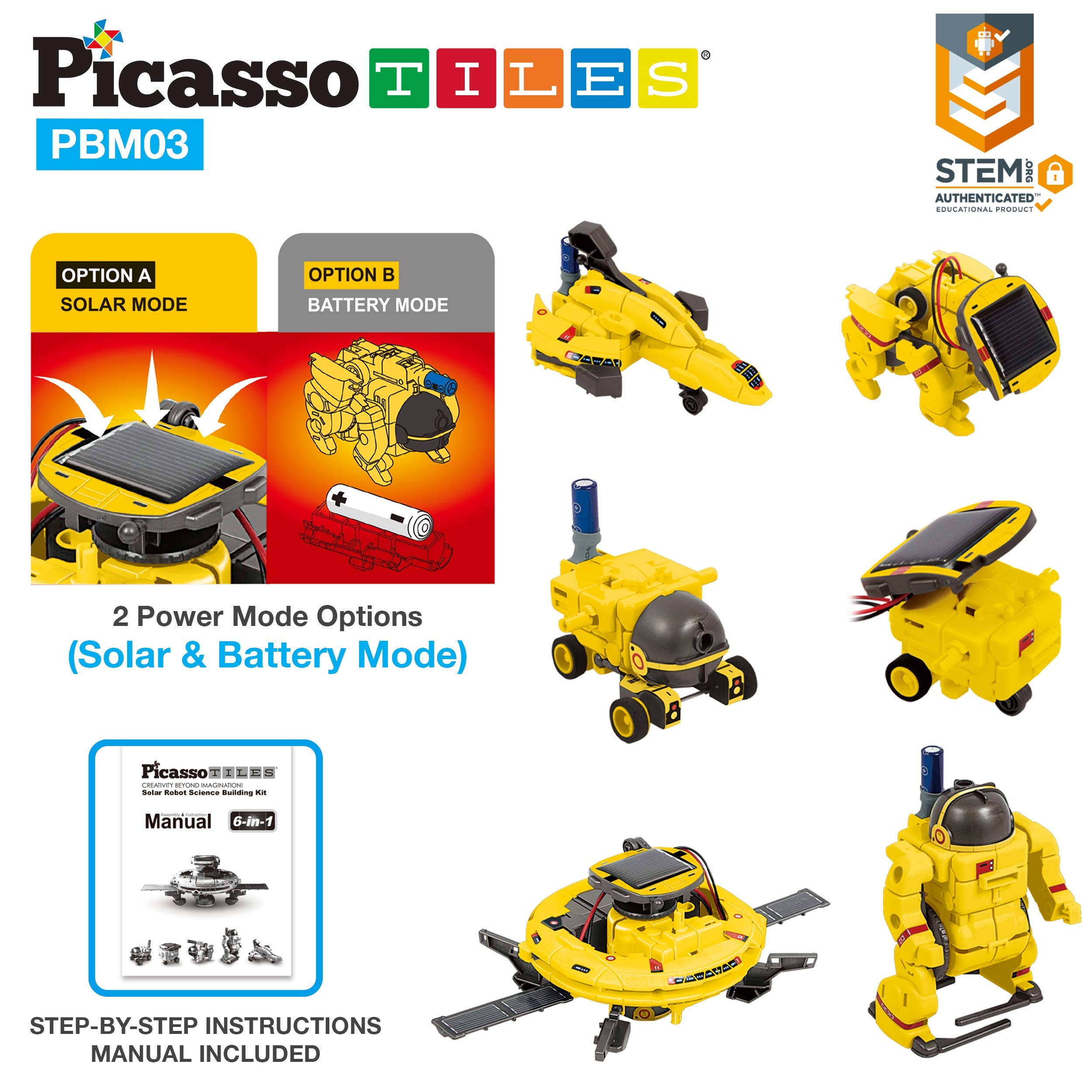 - EDUCATIONAL SOLAR POWER ROBOT- PicassoTiles Solar Power educational 6-in-1 creative transformation DIY engineering kids robot toys helps develop a solid strong STEM (Science, Technology, Engineering, Math) learning foundation for boys & girls ages 8+ and up. The sun powered environmentally-friendly toy does not need batteries and help children learn about the impact of sun powered renewable kinetic energy green technology and cultivate problem solving skills and early child brain development!