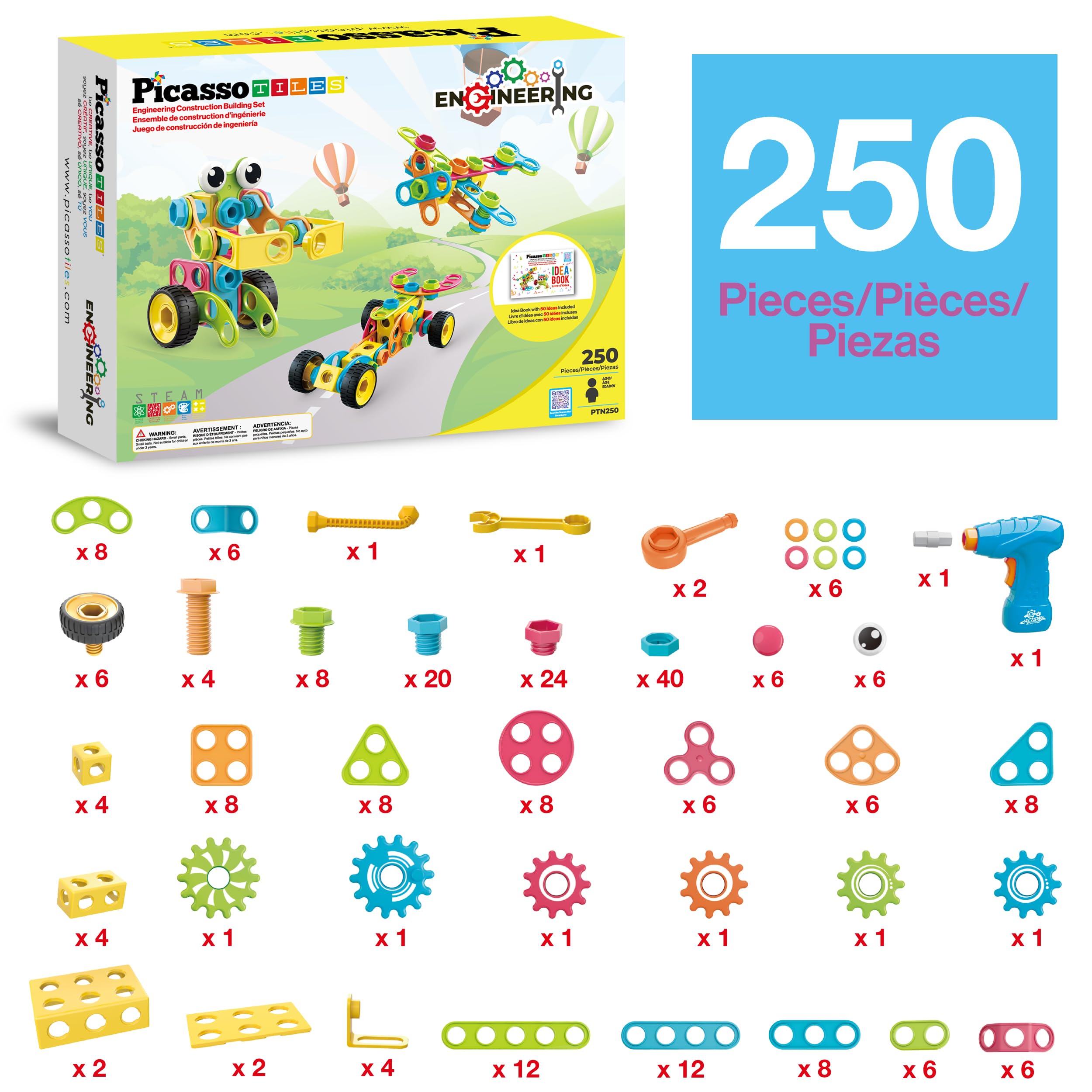 PicassoTiles STEM Learning Toys 250 Piece Building Block Kids Construction Engineering Kit Toy Blocks Children Early Education Playset w/Free IdeaBook, Power Drill, Clickable Ratchet, Age 3+ PTN250